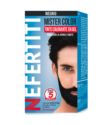 ¡Despídete de las canas en 5 minutos! Mister Color Tinte Colorante de Nefertiti es ideal para cubrir canas en cabello, barba y bigote en sólo 5 minutos. Contiene Queratina que cuida, protege y acondiciona el cabello. Su formula sin amoniaco y en gel permite una aplicación fácil y rápida evitando que escurra. Tinte y Crema Activadora 30 ml c/u